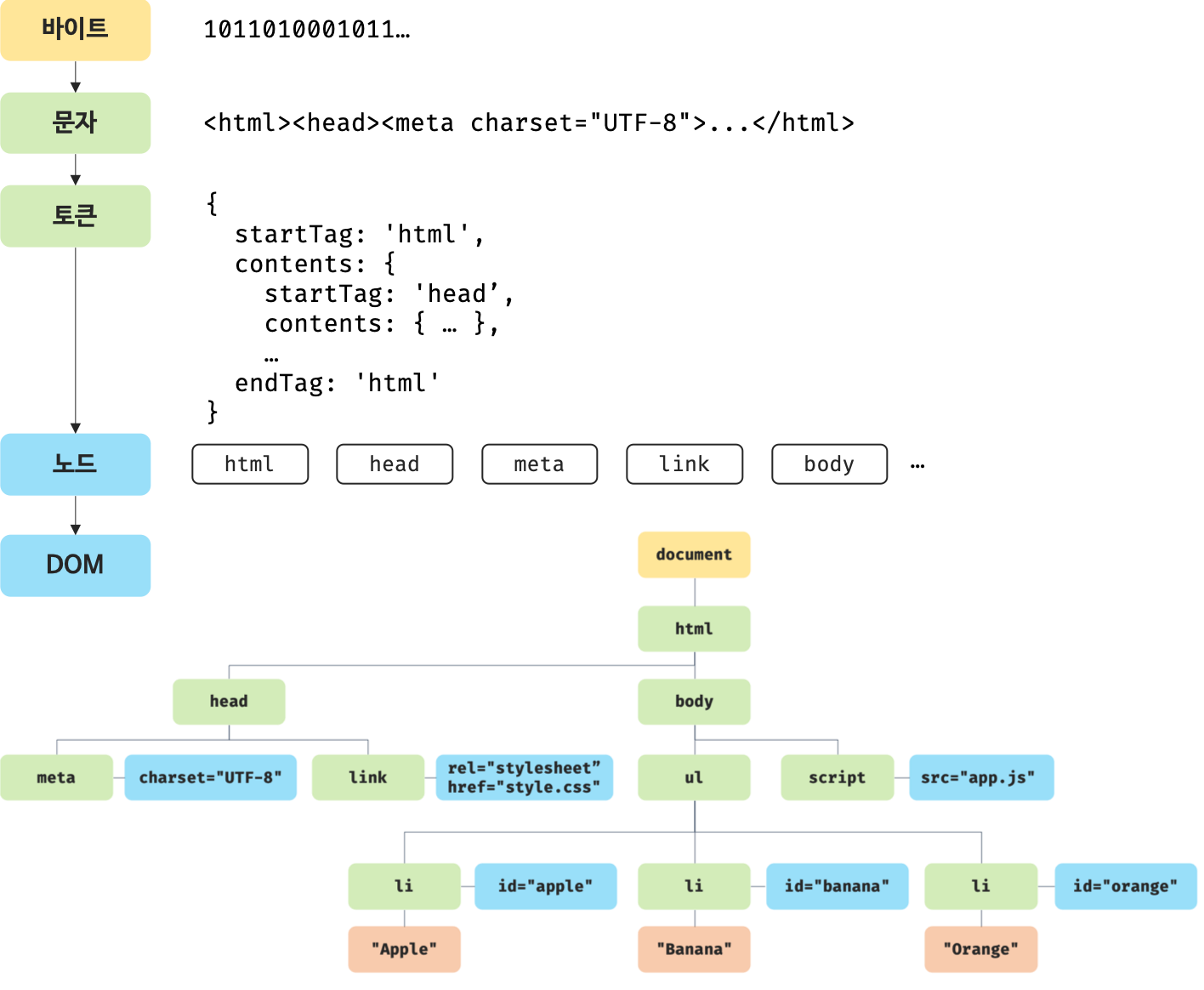 - 브라우저는 바이트(2진수) 형태의 HTML 문서를 받아서 meta 태그의 charset 어트리뷰트에 의해 지정된 인코딩 방식(예 : UTF-8)으로 문자열로 변환한다.
