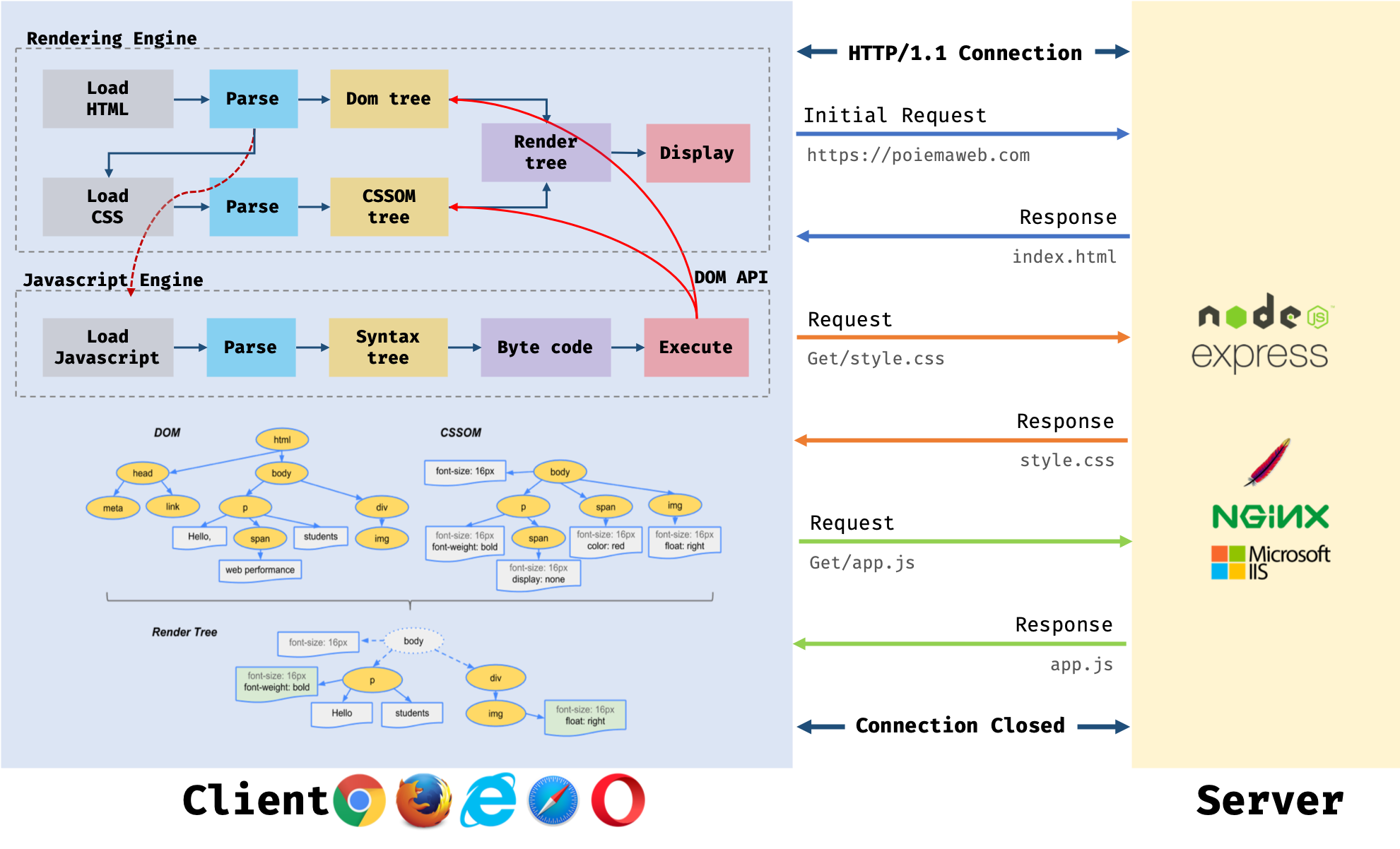 렌더링 엔진은 서버로부터 응답된 HTML과 CSS를 파싱하여 각각 DOM과 CSSOM을 생성하고 렌더링을 위한 렌더 트리로 결합된다.